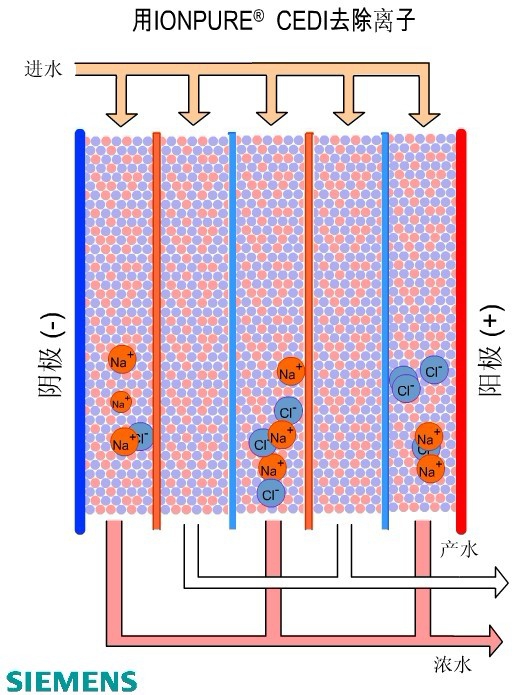 EDI過程一般城市水源中存在鈉、鈣、鎂、氯化物、硝酸鹽、碳酸氫鹽等溶解物。這些化合物由帶負(fù)電荷的陰離子和帶正電荷的陽離子組成。通過反滲透預(yù)處理,99%以上的離子可以被除去。另外,原水中也可能包括其他微量元素、溶解的氣體(例如CO2)和一些弱電解質(zhì)(例如硼,二氧化硅)這些雜質(zhì)在工業(yè)除鹽水中必須被除掉。但是反滲透過程對于這些雜質(zhì)的清除效果較差。